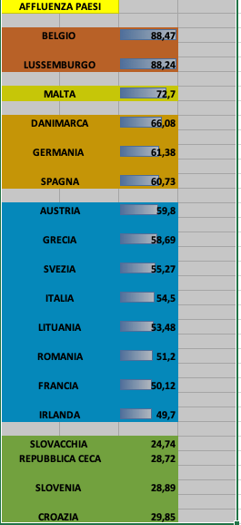 C’è da dire che la mappa dei cittadini dei singoli Stati Ue e dell’affluenza alle elezioni europee del 2019 è molto diversa: a fare la parte del leone sono il Lussemburgo e il Belgio con rispettivamente, l’88,47% e l’84,24% di cittadini aventi diritto che si sono recati alle urne.